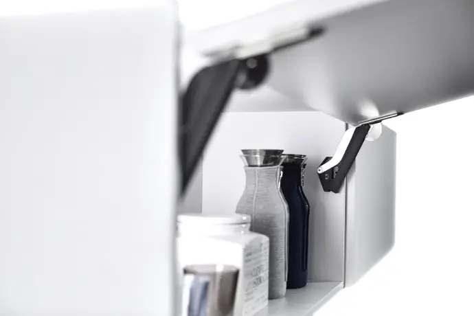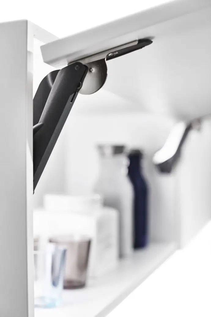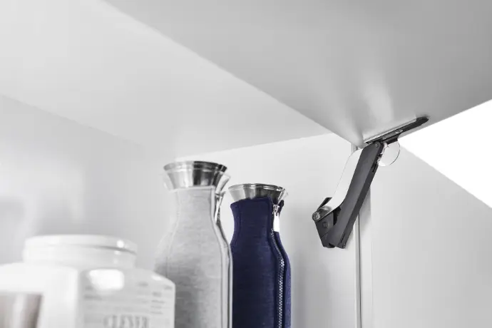 Herraje para sistema de apertura abatible, compacto para insertar dentro del mueble. Color acabado antracita/niquel.
