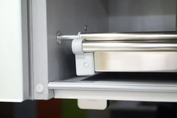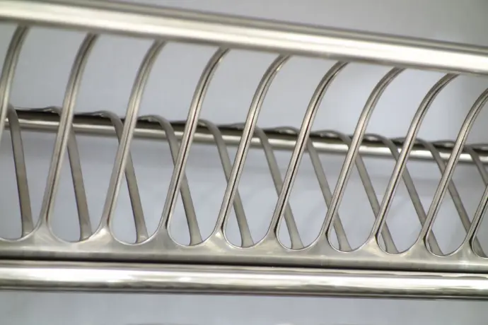 Para colgar los platos en el módulo alto, disponemos del juego escurreplatos, herraje de acero inoxidable compuesto por la bandeja y rejilla inferior para los vasos y rejilla superior para los platos.