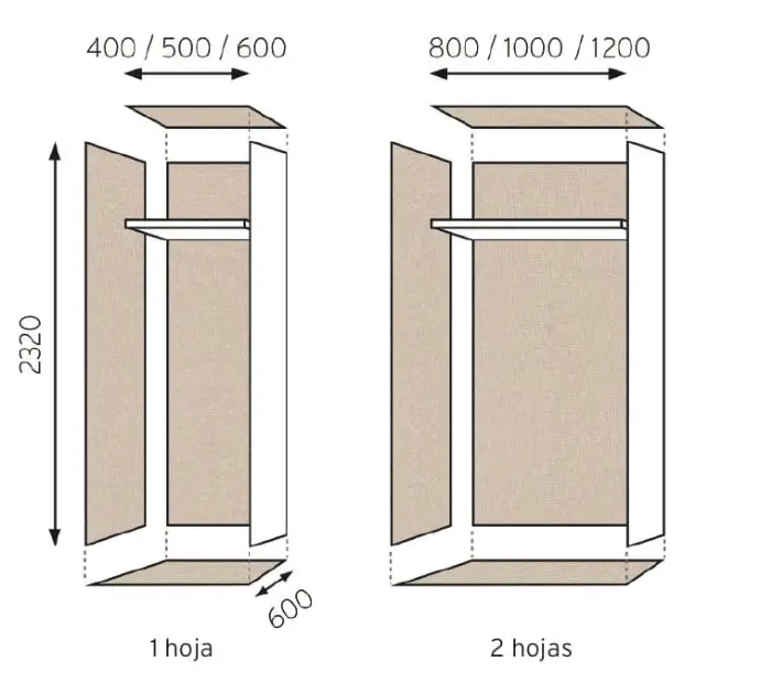 Módulo melamina kit, color Lino Cancún, altura carcasa 2320 mm, fondo 600 mm. Grueso 16mm. Disponibles diferentes anchos 400, 500 y 600 mm en 1 hoja y 800, 1000 y 1200 en 2 hojas.