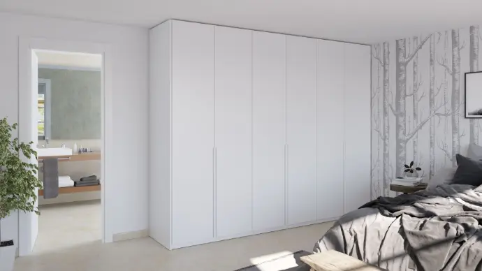 Lacado blanco de la puerta, RAL 9003. Modelo lisa con uñero: Indicar siempre mano izquierda o derecha, apertura vista desde fuera del armario. Grueso puerta 22mm. Modelo 4 ranuras: Grueso 19mm.