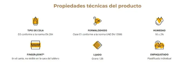 Tablero alistonado de madera maciza de roble, compuesto por listones de 40mm de ancho encolados entre sí por la testa, en unión finger (dentada) y posteriormente encoladas por el lateral largo para confeccionar un tablero resistente, muy estable y con durabilidad.