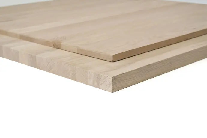 Tablero alistonado de madera maciza de roble, compuesto de listones continuos, de anchos variados de 40mm a 110mm aprox., encolados entre sí por el largo, para obtener un tablero resistente y estable.