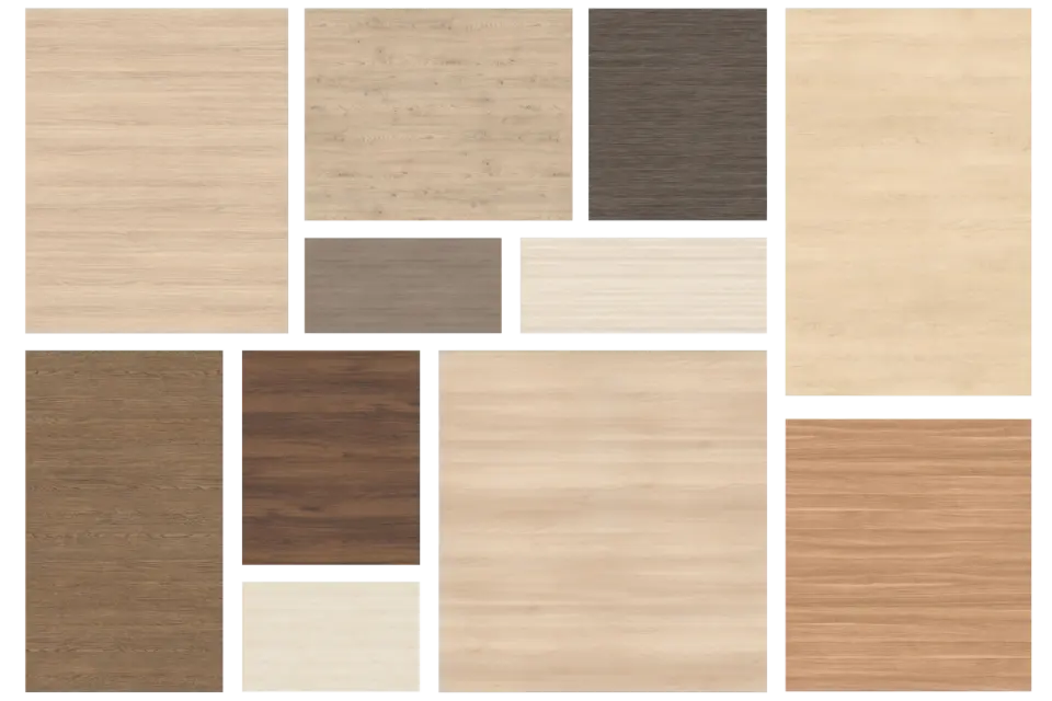 Tablero melaminizado de base aglomerado, revestido con papel de diseño. Gama de colores madera, tipo Fresno, Acacia, Pino, Abeto, Abedul, Haya, Roble natural, Roble Oscuro, Roble con nudos, Castaño, Cerezo, Nogal. Disponibles distintas referencias y acabado ST de la marca Egger, en diferentes grosores de tablero.
